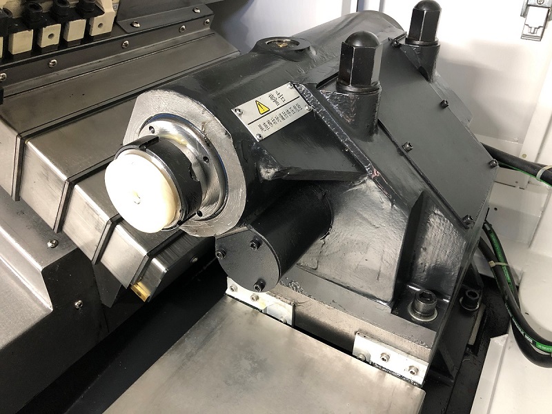 На токарном центре KTL установлен главный двигатель повышенной мощности производства Fanuc (Япония) . Передача крутящего момента с основного двигателя на шпиндель осуществляется за счет клино-ременной передачи, что значительно уменьшает шум при работе. Скорость вращения шпинделя регулируется бесступенчато, что обеспечивает высокую точность и шероховатость обработки. Станок оснащен шпинделем с полым гидроцилиндром для обработки прутков до Ø 75 мм производства Chandox (Тайвань).