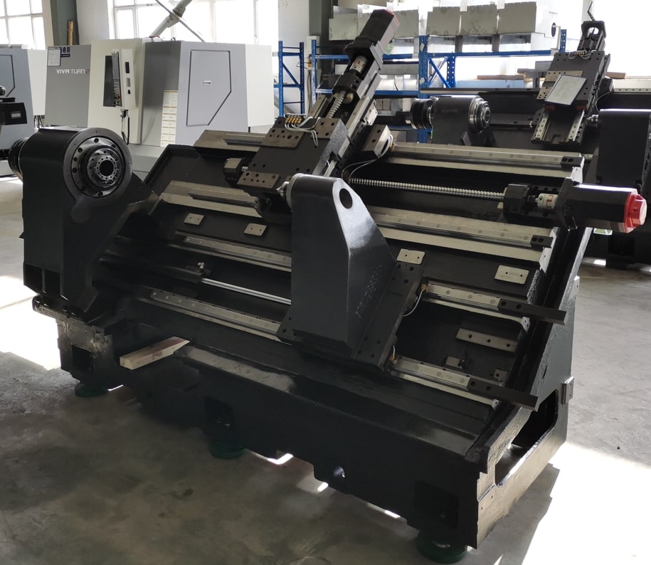 На данной серии станков используется цельная станина с углом наклона 45°, изготовленная из чугуна марки HT300 с внутренними ребрами жесткости. Такая конструкция станины обеспечивает лучшую устойчивость, жесткость, гашение вибраций. Так же наклонная станина занимает меньшую площадь, что позволяет легко удалять стружку и очищать станок.
